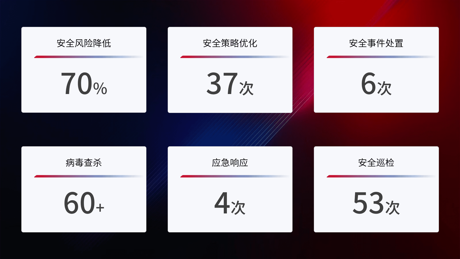 提供全面的安全事件报告体系,,包括处置报告、、、周报、、、、季度和年度总结,,结合持续监控,,,帮助客户深入了解网络安全状况。。。
